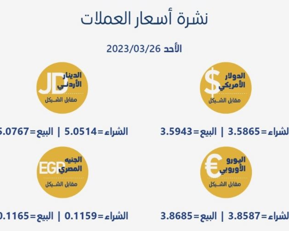 رام الله/PNN- جاءت أسعار العملات مقابل الشيقل الإسرائيلي، اليوم الاحد، حسب سلطة النقد، على النحو التالي:
