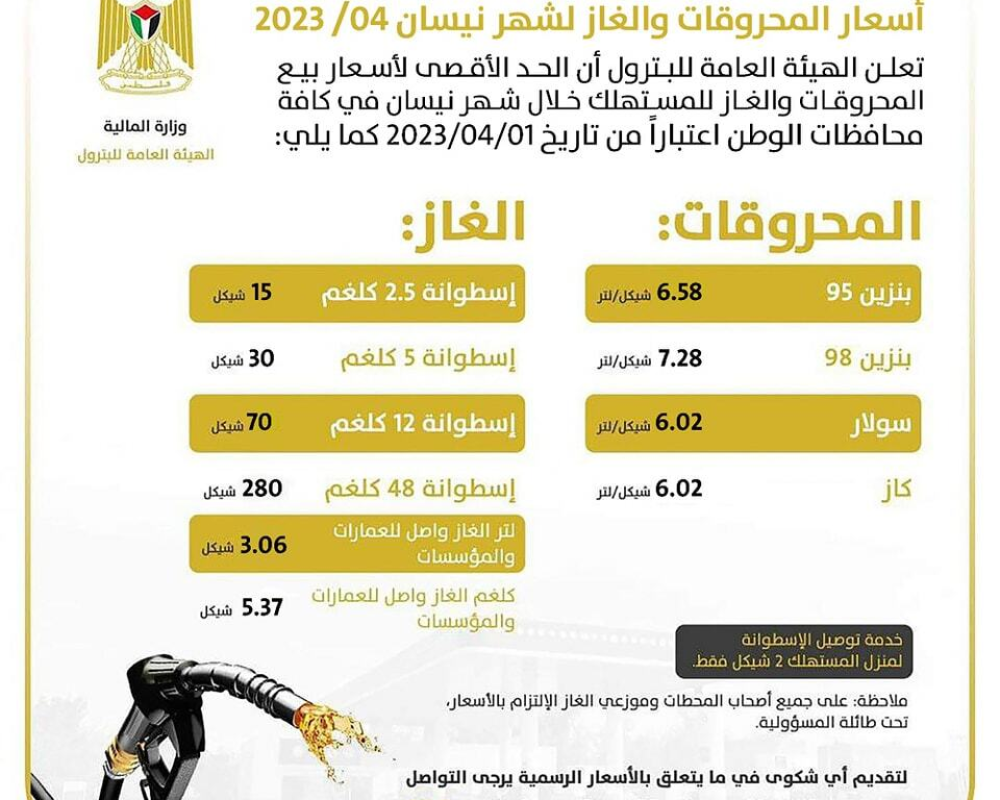 رام الله /PNN- أعلنت وزارة المالية، أمس الجمعة، عن أسعار المحروقات والغاز عن شهر نيسان/ أبريل على النحو التالي:
