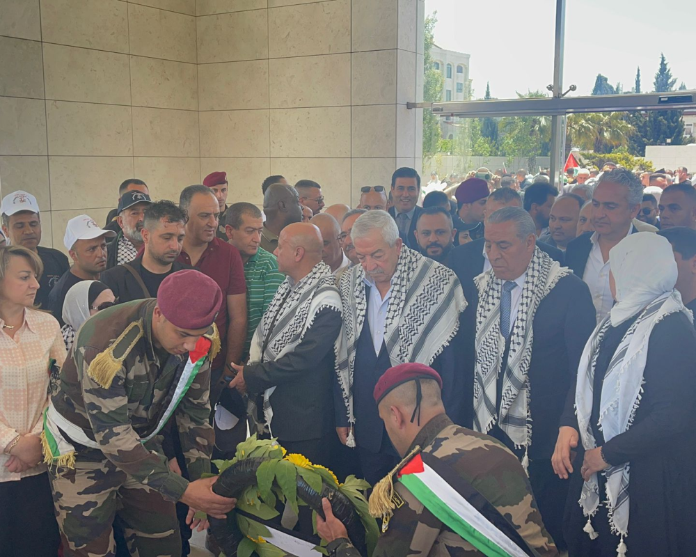 واحتشد المواطنون أمام ضريح الرئيس الشهيد ياسر عرفات، حيث شارك الموظفون وطلبة المدارس والجامعات، وانطلقوا بمسيرة باتجاه ميدان المنارة وسط مدينة رام الله.