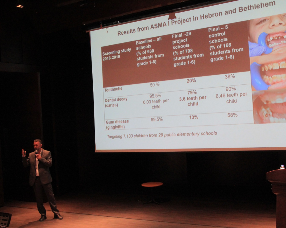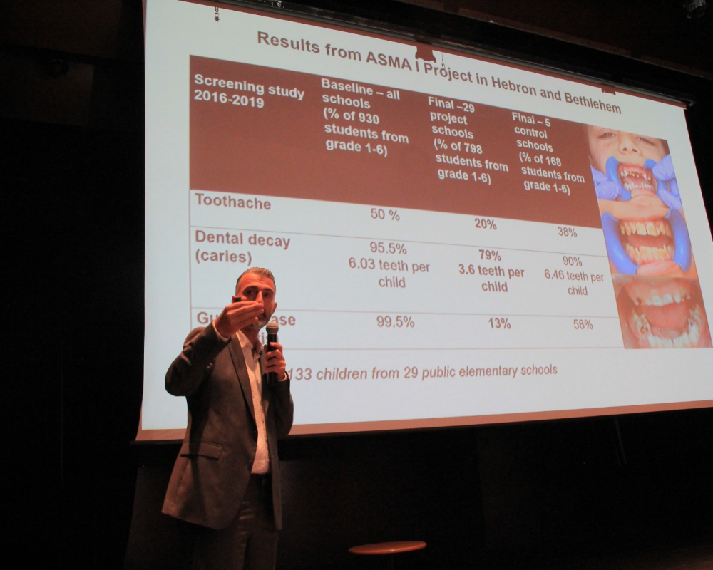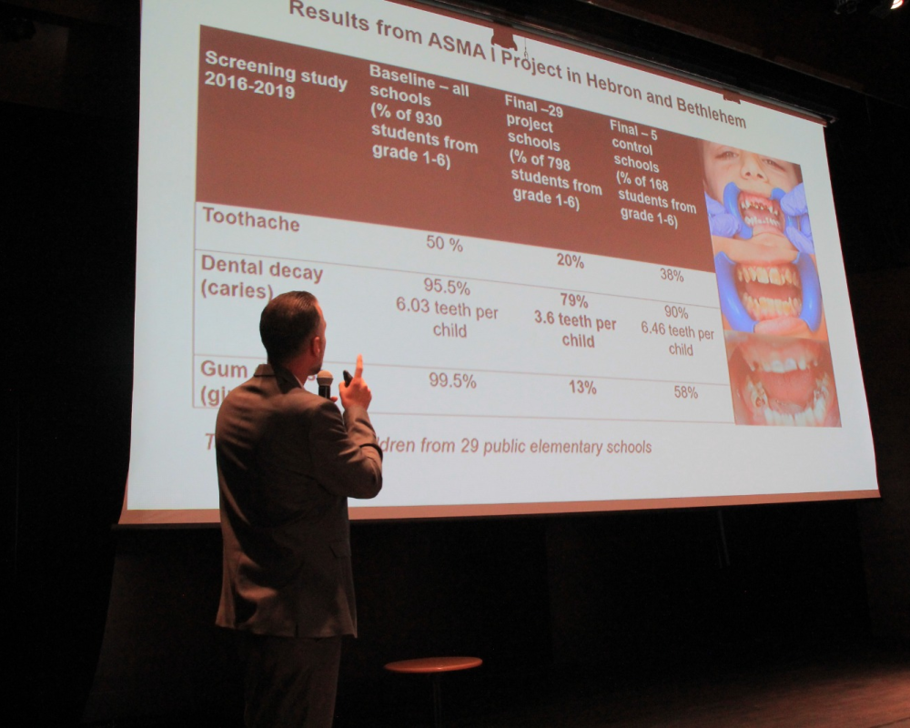 وقدم الدكتور دانيلسن شرحا مفصلا عن العمل بالمشروع على مدار السنوات الماضية والانجازات التي تحققت كما تحدث عن تجربة الدنمارك وكيف انعكس الاهتمام بصحة الفم والاسنان على الطلبة الذين قلت نسبت غيابهم عن المدارس وارتفع تحصيلهم العلمي كما ان صحة المواطنين في بلاده هي الافضل عالميا حيث تاتي هذه النتائج لان هناك نظام ببلاده يهتم بشكل مباشر وفوري بصحة اسنان الطلبة في المرحلة الاساسية معربا عن الامل بتبني هذه التجربة في فلسطين كما اكد على دعم جمعيتهم لكل ما يخدم المجتمع الفلسطيني واطفاله.