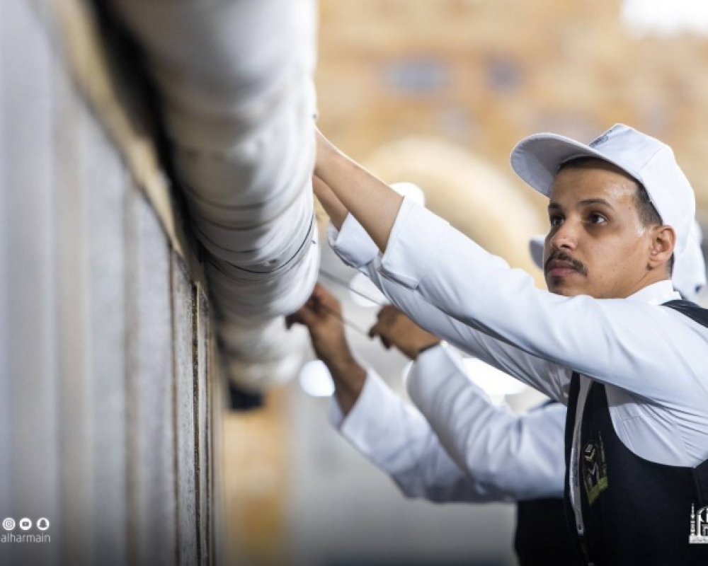 مكة المكرمة/PNN- بدأت الرئاسة العامة لشؤون المسجد الحرام والمسجد النبوي، مساء أمس الجمعة، برفع الجزء السفلي من كسوة الكعبة المشرفة بمقدار ثلاثة أمتار تقريباً، وتغطية الجزء المرفوع بإزار من القماش القطني الأبيض بعرض مترين تقريباً من الجهات الأربع، وذلك كما جرت عليه العادة السنوية استعداداً لموسم حج هذا العام.