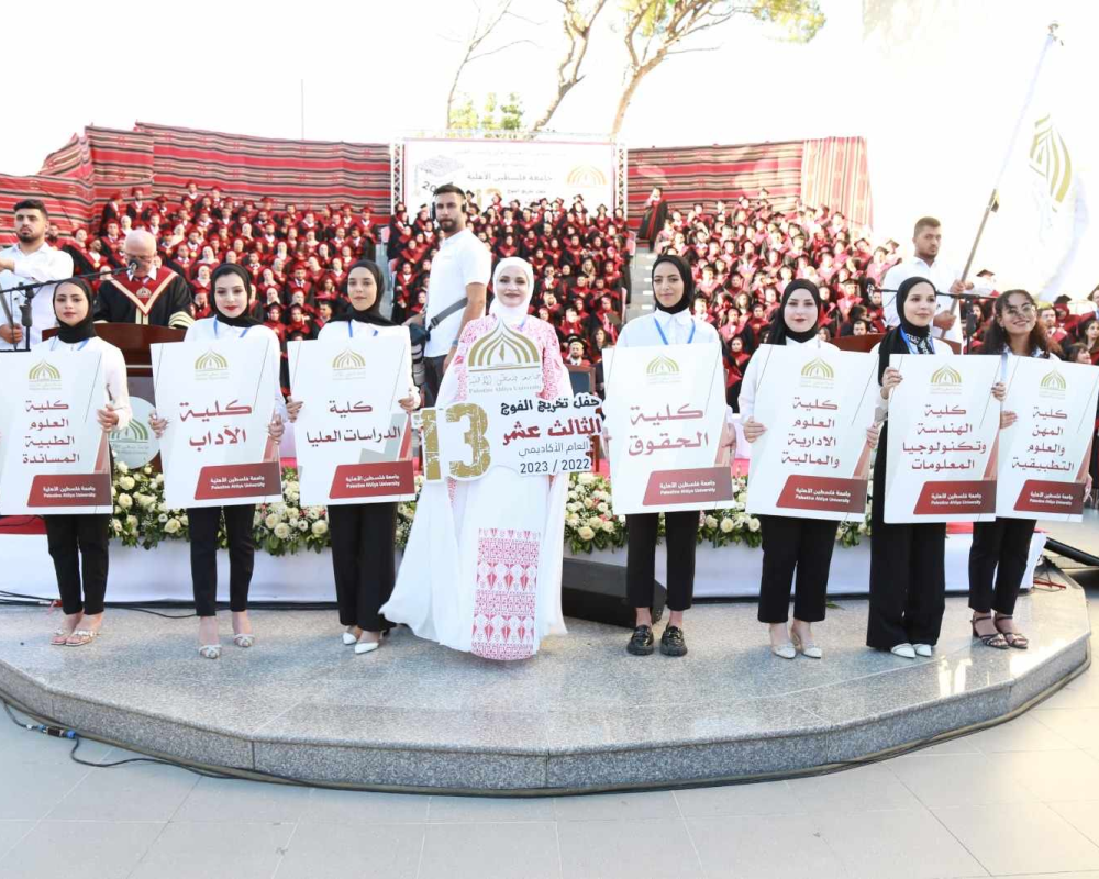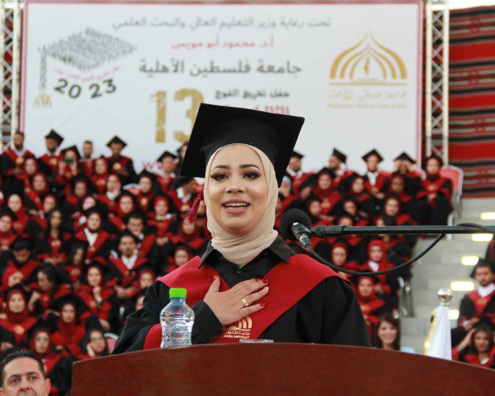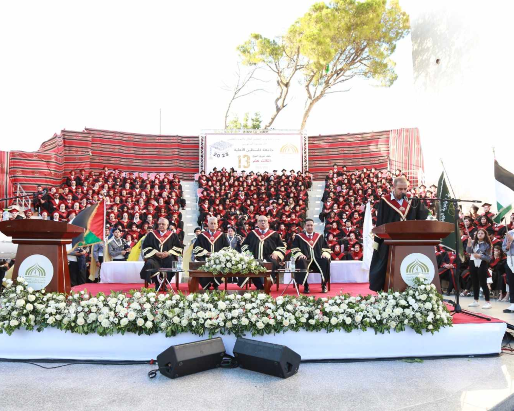 بيت لحم /PNN/ احتفلت جامعة فلسطين الأهلية، اليوم الاربعاء، بتخريج الفوج الثالث عشر من طلبتها في حرم الجامعة برعاية ومشاركة وزير التعليم العالي والبحث العلمي أ. د. محمود أبو مويس، ورئيس مجلس أمناء الجامعة الأستاذ داود الزير، ونائب رئيس مجلس أمناء الجامعة الأستاذ شريف الشطريت، ورئيس الجامعة الدكتور عماد الزير، وقادة الاجهزة الامنية ومدراء الدوائر الحكومية ورؤساء البلديات ومؤسسات المجتمع المدني ورجال الدين المسيحي والإسلامي وأعضاء الهيئتين الأكاديمية والإدارية وأهالي الخريجين.