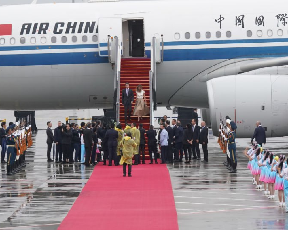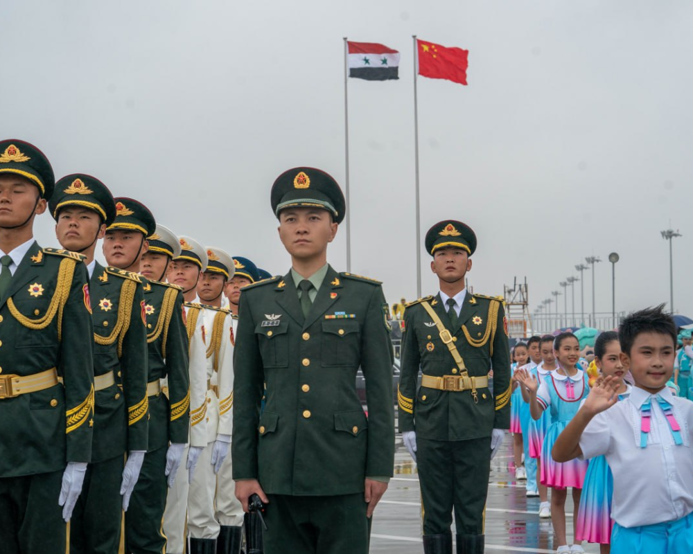 وعلى طرفي السجادة الحمراء اصطف حرس الشرف وخلفهم مجموعة كبيرة من الأطفال الصينيين يحملون الأعلام ويغنون الأناشيد الوطنية والتراثية الصينية. كما قدم طفلان باقتي زهور للأسد وعقيلته.