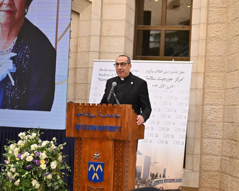 ثم قام القاصد الرسولي في القدس، الرئيس الأعلى لجامعة بيت لحم، رئيس الأساقفة أدولفو تيتو إيلانا بتلاوة الصلاة على المبنى الجديد وحيث قام الأخ بيتر براي وغسان سلامة وزوجته الدكتورة سوافا سلامة بإزاحة الستار عن اسم المبنى الجديد.