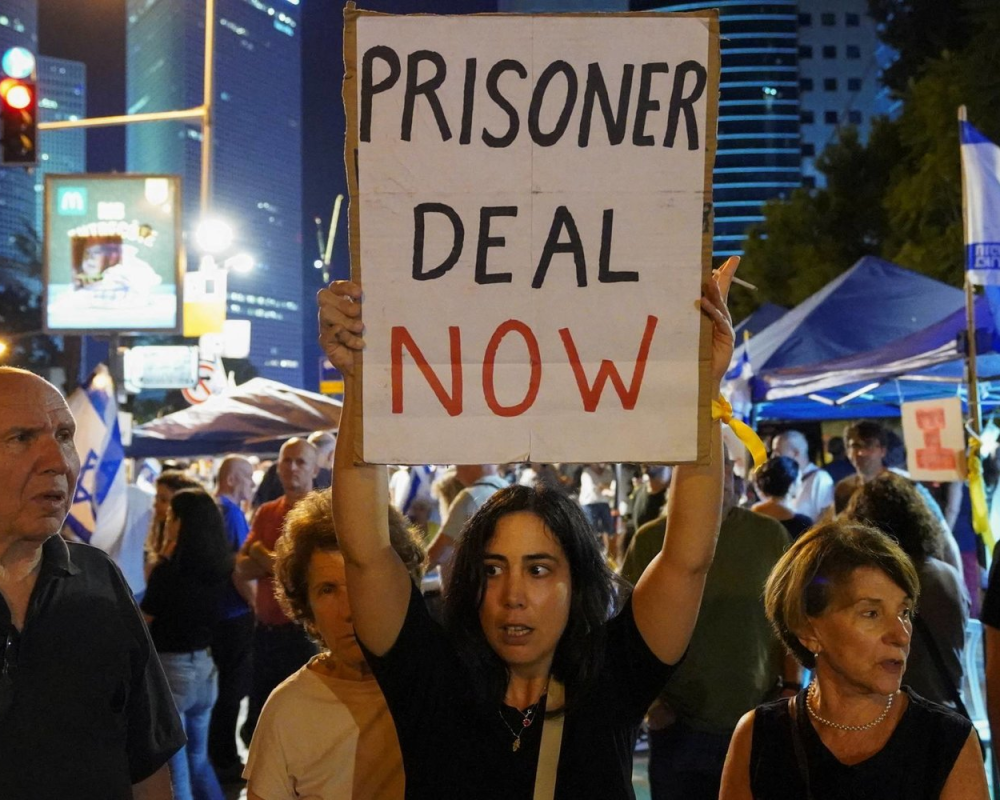 كما تظاهر الآلاف في تل أبيب ملوحين بالأعلام ورافعين صوراً لبعض الأسرى في غزة، ولافتات كتبوا عليها شعارات مثل: “أطلقوا سراح الرهائن الآن بأي ثمن”.