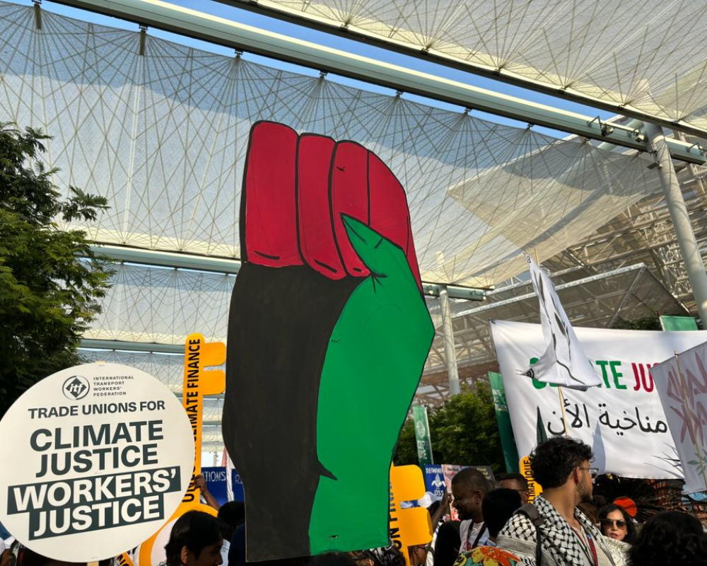 كما رفع المشاركون في المسيرة التي جرت في احد شوارع مدينة اكسبو دبي للمؤتمرات الاعلام الفلسطينية ويافطات كتب عليها شعارات منددة بالجرائم الاسرائيلية ومنها اوقفوا المجزرة والعدالة لفلسطين وانهوا الاحتلال واوقفوا الاستعمار المناخي لفلسطين.