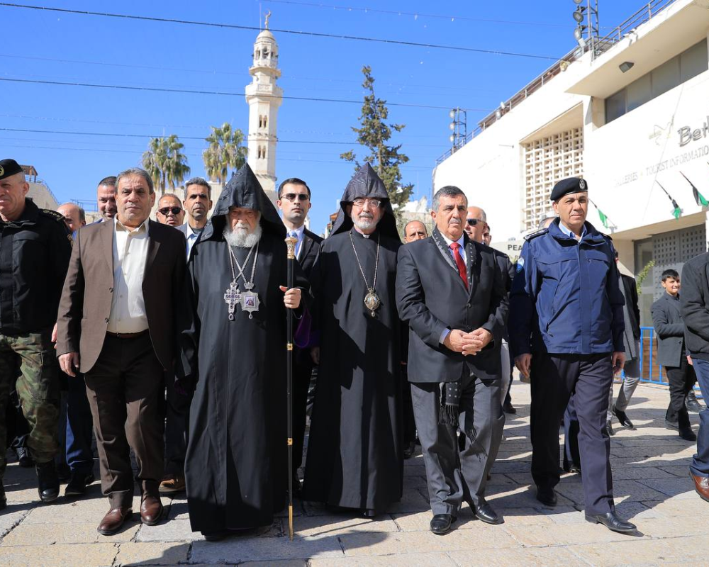 وكان هناك في إستقبال رئيس أساقفة الكنيسة الأرمنية الأرثوذكسية في القدس المطران سيفان غاربيان، لترؤس قداس منتصف الليل، لمناسبة عيد الميلاد المجيد والغطاس، حسب تقويم الكنيسة الأرمنية. القائم باعمال محافظ محافظة بيت لحم محمد طه ابو عليا، ورئيس بلدية بيت لحم، المحامي أنطون سلمان، بالإضافة لقادة ومسؤولي الأجهزة الأمنية ورجال الدين ووجهاء من المحافظة وطائفة الارمن.