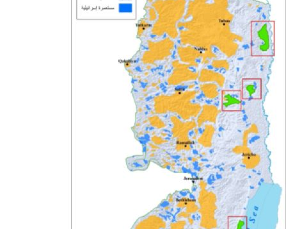 هذا ويسيطر الاحتلال الإسرائيلي على أكثر من 90% من أرض فلسطين التاريخية: منها الأراضي خلف الخط الأخضر وما تم تصنيفه بالمناطق "ج" (3456 كيلومتر مربع – 61% من مساحة الضفة الغربية) بحسب اتفاقية أوسلو والتي تخضع فيما يتعلق بالأمن والتخطيط والبناء بالكامل لسيطرة الاحتلال الاسرائيلي، والذي تهيمن فيه المجالس الإقليمية للمستوطنات التي بلغت مساحة مناطق نفوذها 545 كيلومتر مربع وهي ما نسبته حوالي 10% من مساحة الضفة الغربية (5661 كيلومتر مربع )، هذا بالإضافة الى ما تم مصادرته تحت مسمى أغراض عسكرية، بما في ذلك مواقع التدريب العسكري والتي تشكل قرابة 18% من مساحة الضفة الغربية 1,019 كيلومتر مربع، إضافة الى إلى جدار الفصل الممتد عبر 771 كيلومتر والذي يكرس عملية فصل والاستحواذ على اكثر من 12% من مساحة الضفة الغربية، واستهداف ما يزيد على 90 تجمع فلسطيني بالغزل عن المدن الرئيسية او فصل المناطق السكنية عن الأراضي الزراعية.