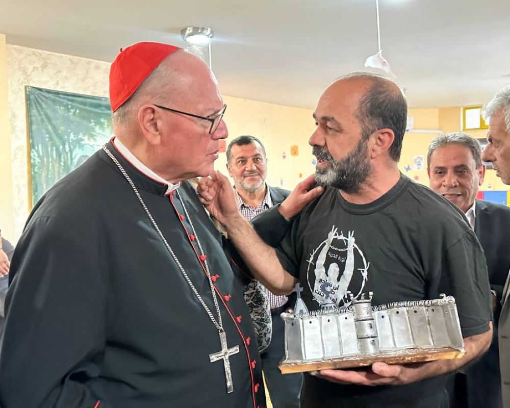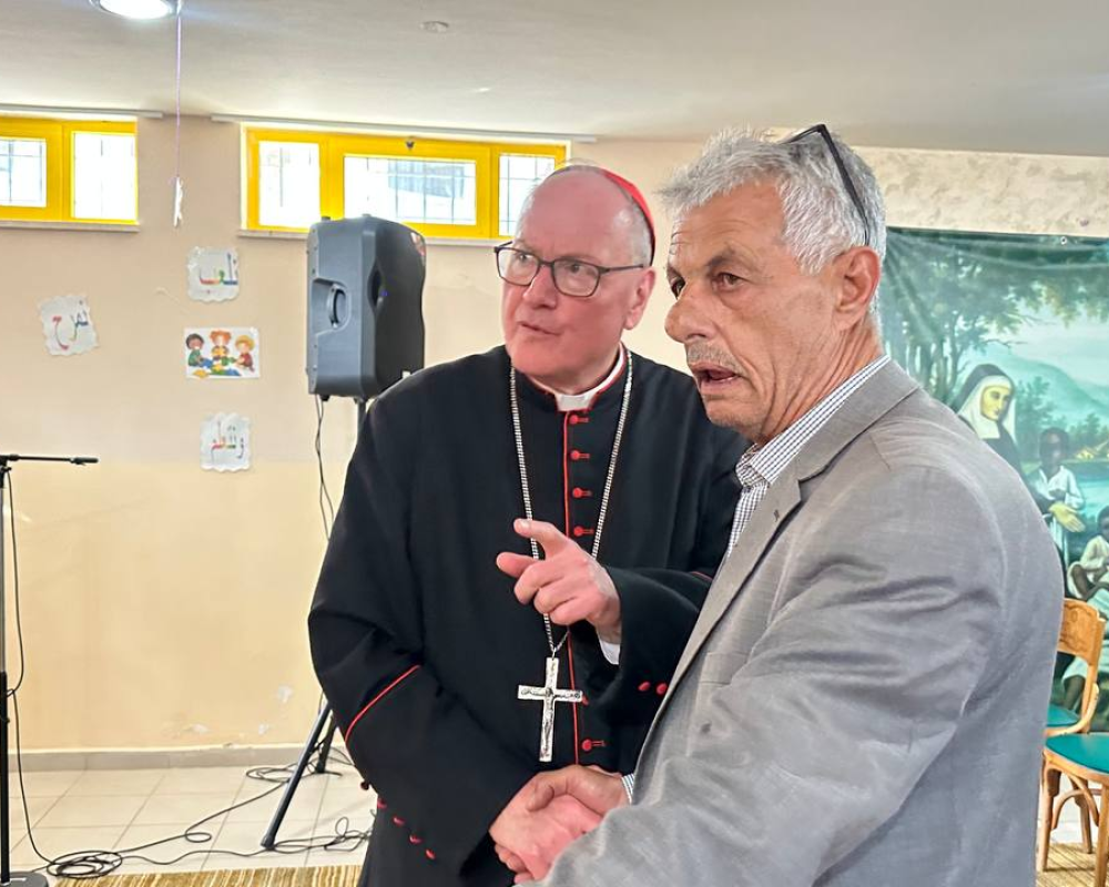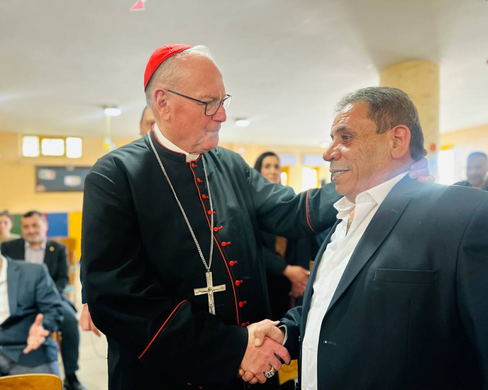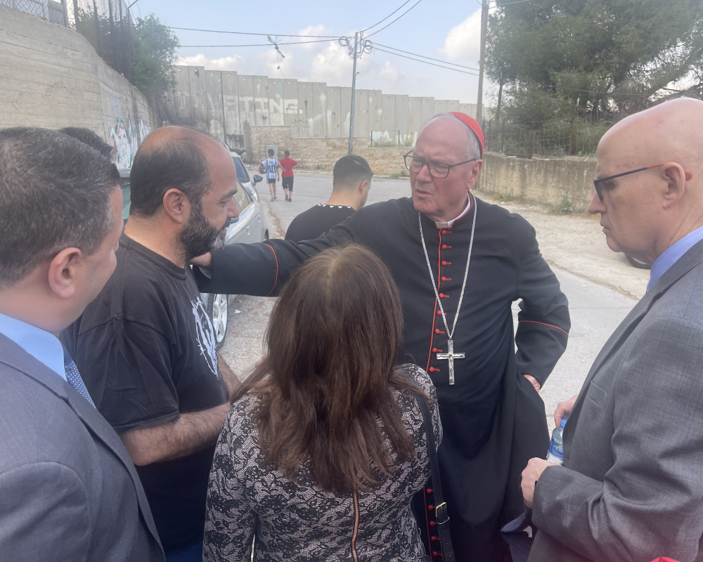 و شكر المحافظ الكاردينال تيموثي دولان رئيس اساقفة نيويورك رئيس البعثة البابوية في فلسطين مشددا على ان لهذه الزيارة وبمناسبة مرور ٧٥ عاما لبيت لحم ومخيم اللاجئين له دلالات بوقوف البعثة مع الحقوق الفلسطينية وعلى راسها حق العودة معربا عن اعتزازه بمؤسسة البعثة كونها مؤسسة عريقة تعمل في فلسطين لمساعدة ابناء شعبنا جميعا مضيفا ان الجميع مستهدفين كمسلمين ومسيحيين من قبل هذا الاحتلال الذي يستهدف وجودنا وحقوقنا وما هذا الجدار القريب منا و الجاثم على اراضي بيت لحم الا دليل على الاستهداف لكل الفلسطينيين.