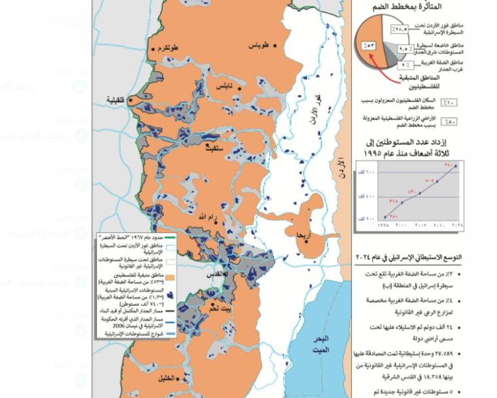 وجاء في التقرير ان وزير المالية الإسرائيلي اليميني المتطرف بتسلئيل سموتريتش يواصل السياسات الاستيطانية وضم الأراضي في الضفة الغربية، بما في ذلك القدس المحتلة، ما يؤدي إلى تآكل المصالح الفلسطينية بشكل مستمر. يعيش حاليًا حوالي 740 ألف مستوطن إسرائيلي في مستوطنات الضفة الغربية، من بينهم 240 ألفًا في القدس المحتلة، وسط تسارع عمليات البناء الاستيطاني لتعزيز السيطرة الإسرائيلية وفرض واقع جديد على الأرض.