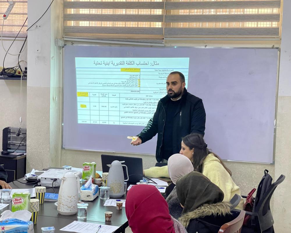 من ناحيته قدم المهندس وسام صبيح مهندس المشروع شرحا عن اليات المعتمدة في حساب التكلفة للمشاريع وهو الامر الذي يعتبر من اهم خطوات تنفيذ اي مشاريع موضحا ان عملية الاحتساب تتم من خلال زيارات للموقع لمعرفة تفاصيل المشاريع من خلال التعرف على الواقع كما قدم صبيح نماذج عملية لاحتساب تكاليف بعض المشاريع لتعريف الحضور بتفاصيل الاحتساب .