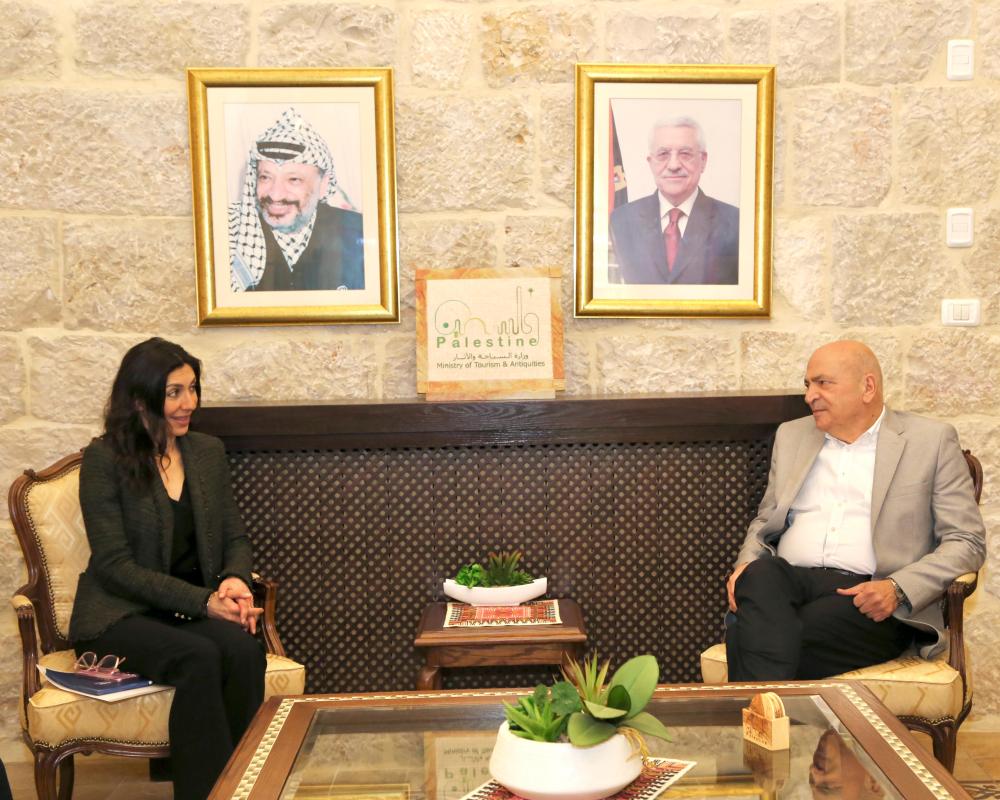 وتباحث الوزير الحايك ومديرة اليونسكو في عدد من المشاريع والتي ستسهم في دعم الحفاظ على التراث الثقافي في فلسطين بالاضافة للتعرف على طاقم مكتب اليونسكو الجديد في فلسطين