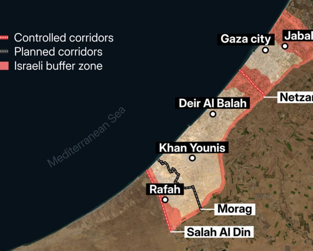 وبحسب تصريحات بعض الضباط الإسرائيليين في الأسابيع الأخيرة، يخطط جيش الاحتلال لدفع مئات الآلاف من سكان القطاع الذين يعيشون في الخيام في منطقة المواصي جنوباً. ووفقاً للخطة، سيمر السكان عبر معابر عسكرية إلى ما يُسمى "منطقة إنسانية" جديدة تمتد بين محور صلاح الدين (فيلادلفي) ومحور موراج وتشمل رفح. ويتطلع جيش الاحتلال إلى أن توزّع المنظمات الإنسانية الغذاء والمساعدات على السكان في المنطقة، بينما تتولى شركات أميركية خاصة تأمين عملية التوزيع.
