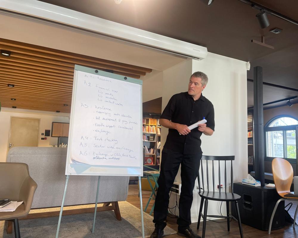 وشدد المتحدثين ان الهدف اليوم من اللقاءات مع الشركاء او ممثلي الاعلام يهدف الى معرفة الواقع الاعلامي و نماذج اعمال و نشاطات الصمود و افكار التمويل و تطوير التعليم في الاعلام التقليدي من حيث تطوير مناهج.