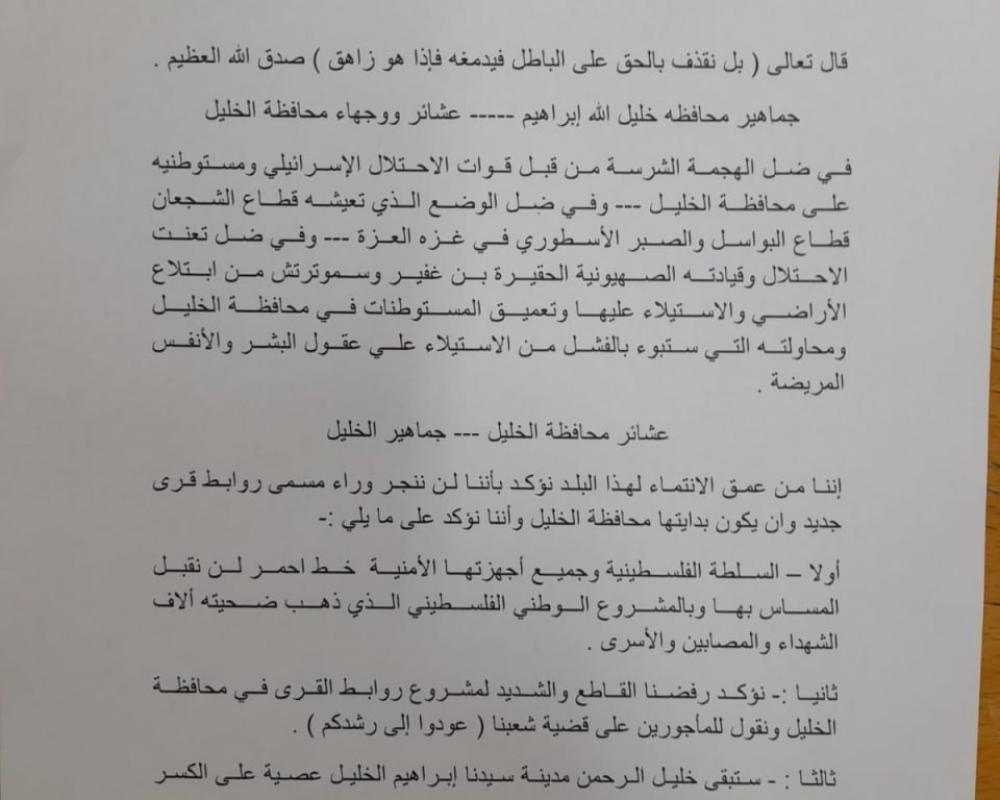 وجاء بيان عشائر محافظة الخليل كردٍ شعبي صريح وواضح يرفض الانخراط في أي مشروع يهدف لتقسيم الفلسطينيين أو ضرب تمثيلهم الوطني.