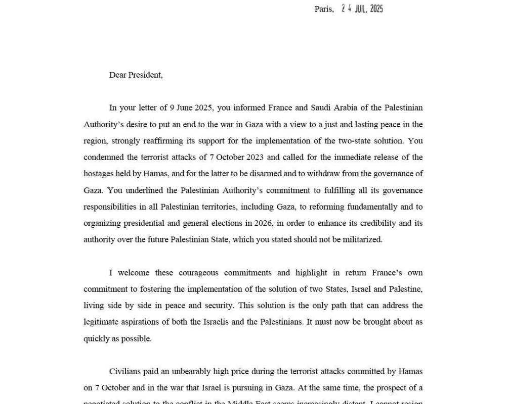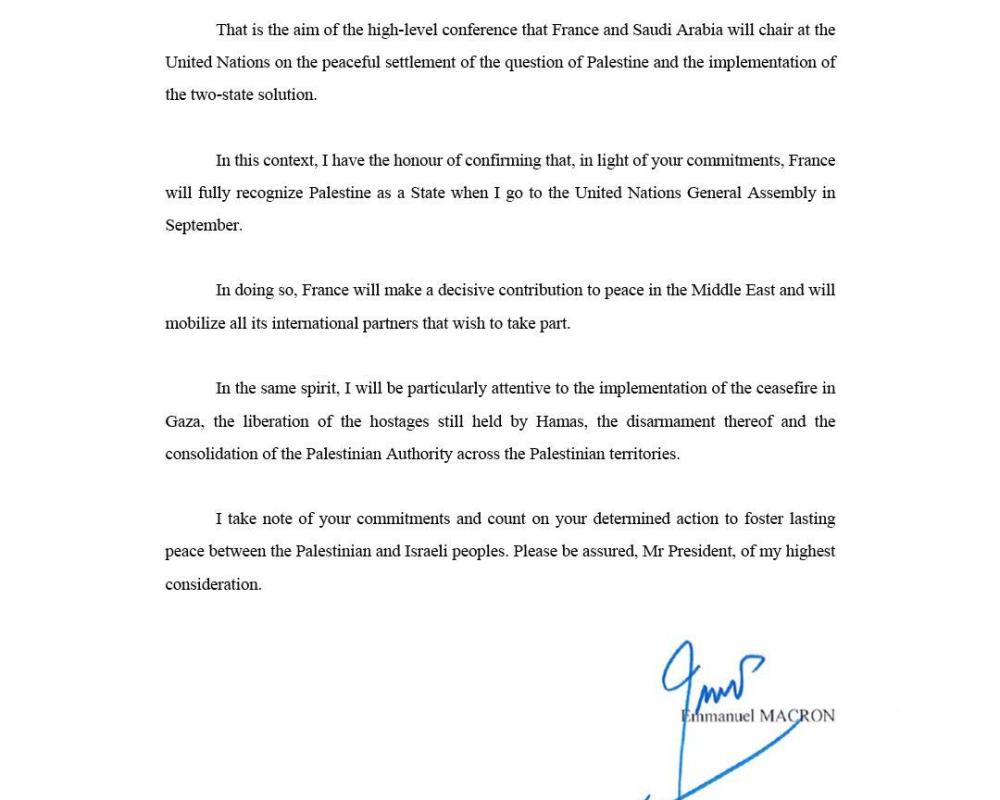 وجاء في رسالة ماكرون المؤرخة بتاريخ 24 تموز/يوليو 2025، والتي اطلعت عليها شبكة فلسطين الإخبارية (PNN)، أن فرنسا تشيد بما وصفه بـ"الالتزامات الشجاعة" التي أعلنتها القيادة الفلسطينية، ولا سيما فيما يتعلق بتجديد دعمها لحل الدولتين، وإدانة الهجمات التي وقعت في 7 تشرين الأول/أكتوبر 2023، والدعوة للإفراج الفوري عن الرهائن المحتجزين لدى حركة حماس، إضافة إلى دعم نزع سلاح الحركة وانسحابها من إدارة قطاع غزة.