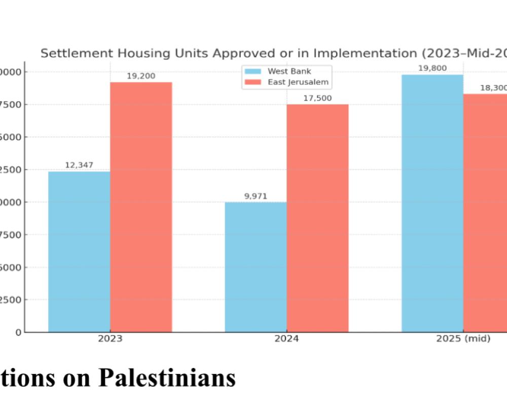 منذ أبريل 2024، وافقت السلطات الإسرائيلية على بناء ما يزيد عن 3,165 وحدة استيطانية في معاليه أدوميم، فيما يجري التحضير لآلاف أخرى في مختلف مناطق الضفة الغربية خلال العام الجاري. كما تم تفعيل مخطط E1 مجددًا، ويشمل بناء 3,400 وحدة سكنية ومجمعات صناعية وتجارية على أكثر من 12 كيلومترًا مربعًا من أراضي الفلسطينيين المصادرة.