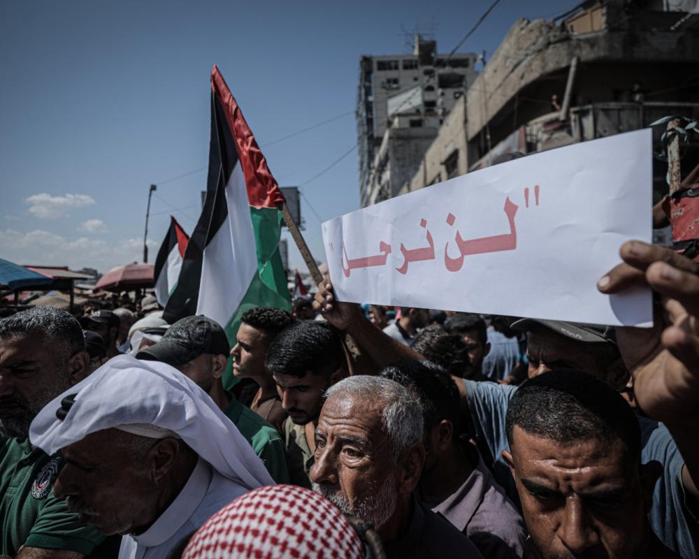 وأكد المشاركون في المسيرة، رفضهم مغادرة المدينة، وإصرارهم على البقاء فيها، ورفض كل مخططات التهجير القسري التي تحاول إسرائيل فرضها تحت وطأة القصف والحصار.