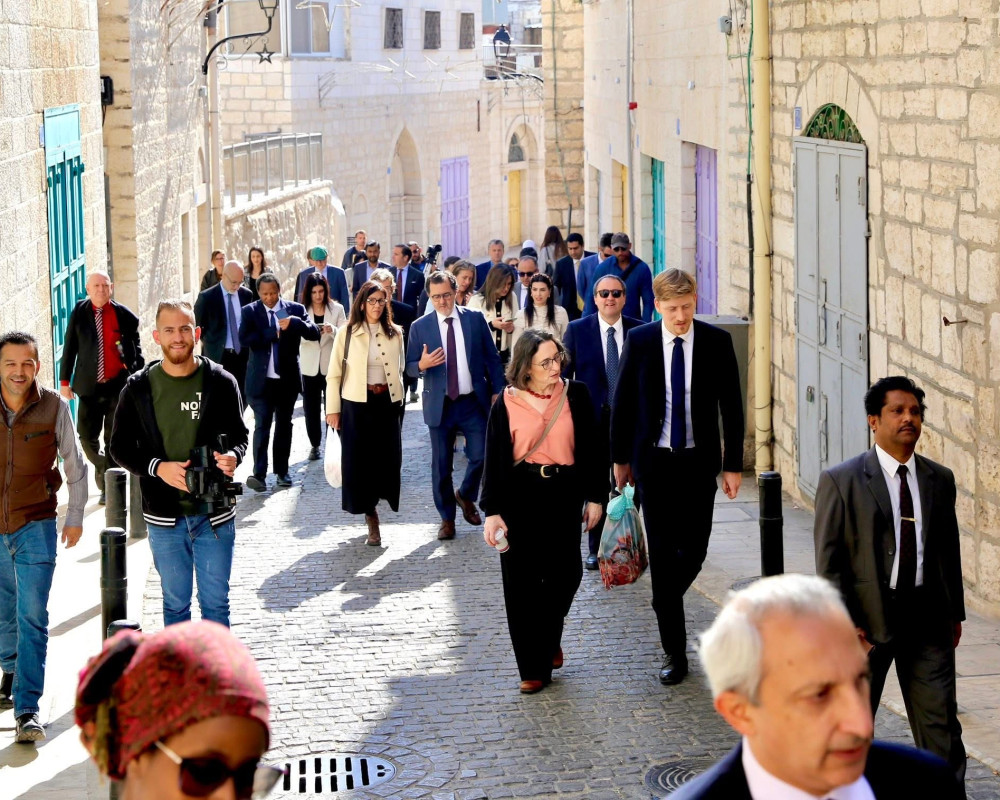 هذا وعبر عدد من الدبلوماسيين الاجانب عن دعمهم للشعب الفلسطيني مؤكدين على اهمية تعزيز علاقات التعاون من خلال تطوير و تعزيز برامج سياحية متعددة كما وجهوا دعوات لشعوبهم لزيارة فلسطين وبيت لحم وكل مدنها السياحية كونها مدن هادئة وجاهزة لاستقبالهم.