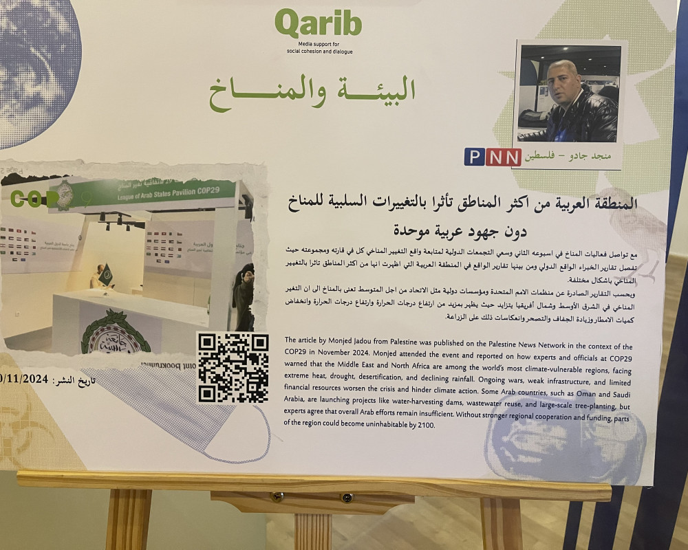 وقال جادو ان مشاركته في فعاليات معرض برنامج قريب الممول من الوكالة الفرنسية للتنمية الاعلامية كانت ناجحة وان برنامج قريب والمناخ اعطى شبكة PNN للعمل على تغطية مؤتمرات المناخ في السنوات الاخيرة والتعرف على ملفات عديدة تعنى بقضايا البيئة والتغيير المناخ بما يخدم الجمهور العربي والفلسطيني ليكون جزء من محاربة التغييرات المناخية السلبية عبر توعيتهم مشيرا الى ان شبكة PNN انتجت العديد من التقارير المهمة كما تم اطلاق موقع صحفيون عرب من اجل المناخ الذي يعمل حتى الان بمبادرة تطوعية من صحفيين من الاردن وفلسطين والعراق ولبنان معربا عن الامل ان يتم تبني هذا الموقع من مؤسسات داعمة وتمويل الاعلام حيث تم مناقشة هذا الموضوع مع عدد من المانحين الذين شاركوا بمؤتمر اريج الثامن عشر الذي عقد في عمان.