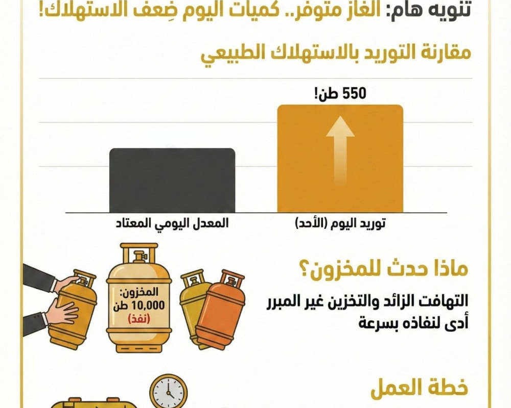 وأكدت الهيئة المواطنين، أن الغاز موجود والضخ مستمر، داعية إلى الاكتفاء بالكميات اللازمة فقط، وعدم التخزين الزائد، بما يضمن وصول الغاز لجميع المواطنين دون ضغط على السوق.