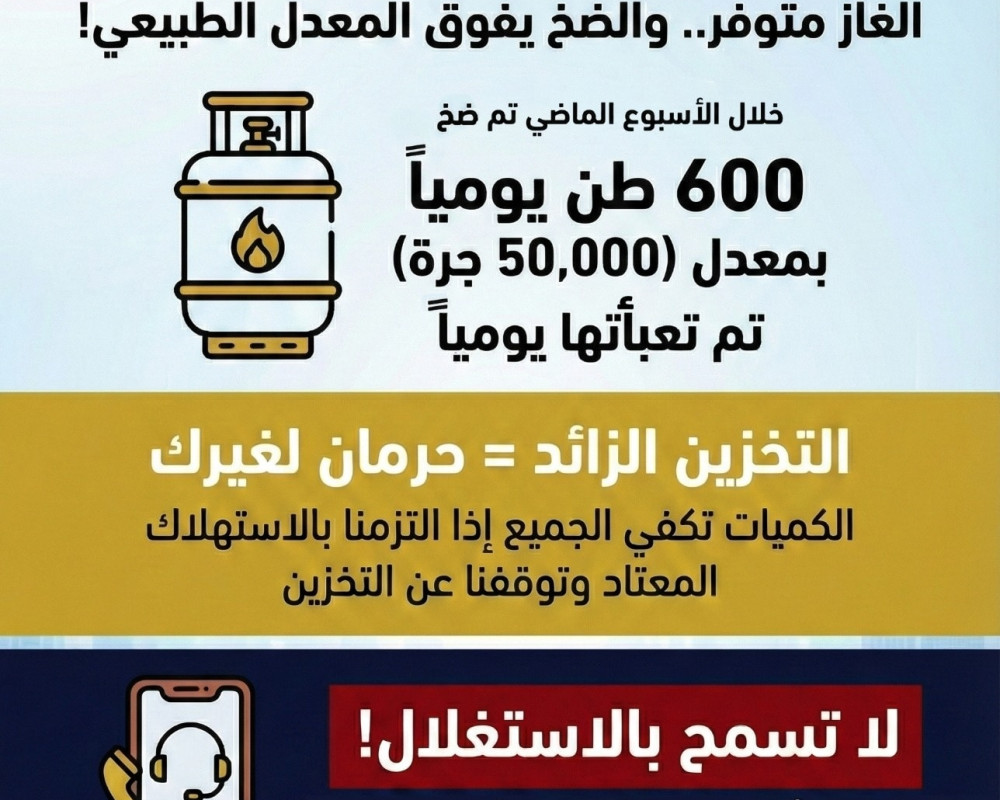 وشددت الهيئة على أن التخزين الزائد يؤدي إلى حرمان مواطنين آخرين من حقهم في الحصول على الغاز، داعيةً المواطنين إلى التحلي بالمسؤولية وعدم التخزين غير المبرر، بما يضمن عدالة التوزيع واستقرار السوق.