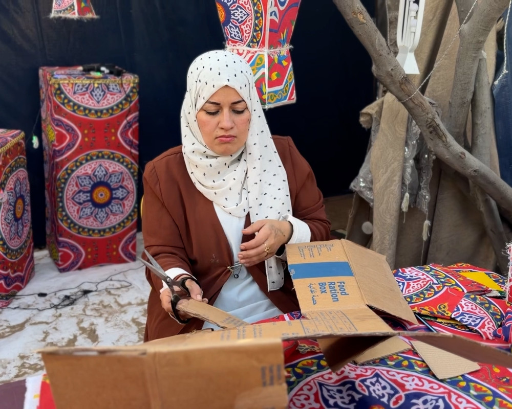 وعلى الرغم من أن المواد الأساسية نادرة، جمعت ريهان ما استطاعت من كرتون المساعدات والقماش المتوفر بصعوبة من بعض التجار في مدينة غزة القديمة حيث يحتفظ بعضهم بهذه الانواع من المواد، لتعيد تدويرها وتحويلها إلى قطع فنية تحمل روح الشهر الفضيل. "حتى الطرود الإغاثية قليلة، لكن ما يصلنا أحافظ عليه لاستخدامه في صناعة الفانوس"، تضيف ريهان في حديثها ل PNN.